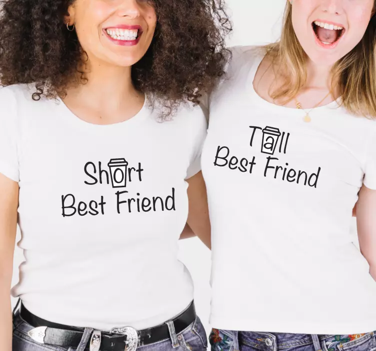 Reference: T4553This image features two friends wearing matching shirts that humorously label their heights. One shirt states 'Short Best Friend' while the other reads 'Tall Best Friend'. The playful text emphasizes their camaraderie and connection.