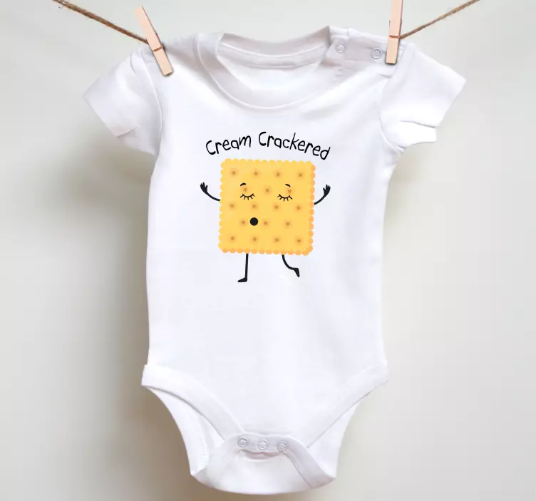 Cream crackered Kids t-shirt - Cute illustration of a cartoon cracker biscuit, it is funnily illustrated with hands, weak legs and sleepy eyes, looking tired. On the top of the cracker biscuit illustration is the text phrase ''Cream crackered'', a London cockney rhyming slang, knacker, meaning extremely tired, exhausted or sleepy. Its a cute shirt for baby, the print is original, no fading and it it not allergic. Easy to maintain, long lasting and available in sizes. Place your order for the product in the options that suit you to receive it in few days.