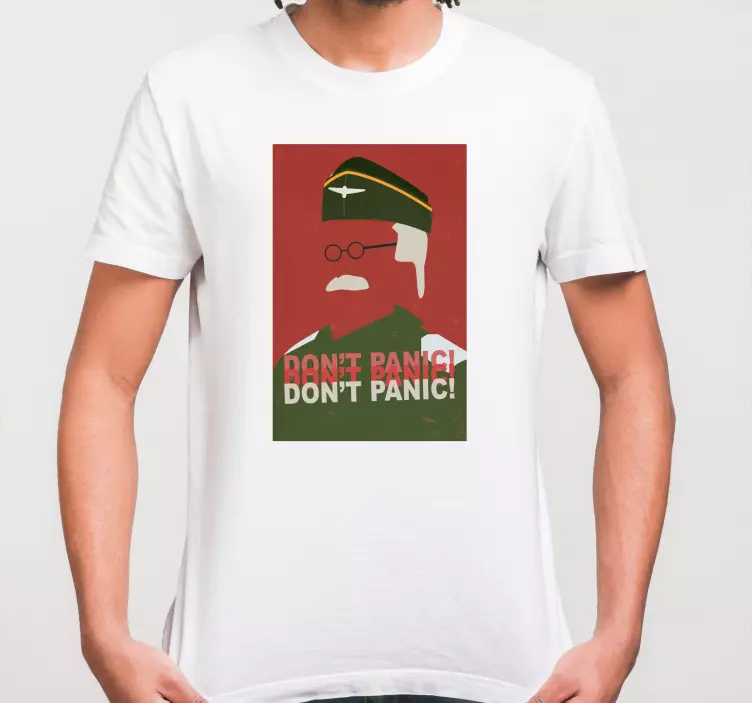 Don't panic movie quote t-shirt , lovely design inspired by a famous classic movie series. It illustrates an army silhouette and the quote excerpt ''Don't panic'' from the popular series, the background is red with grungy texture, it text lettering is stylish. The shirt colour can be customized in the colour options that we have on the catalog. The material is of quality, easy to maintain, the design is printed with quality ink which is eco-friendly. It comes in different sizes, select the options that suit you and place order for it.