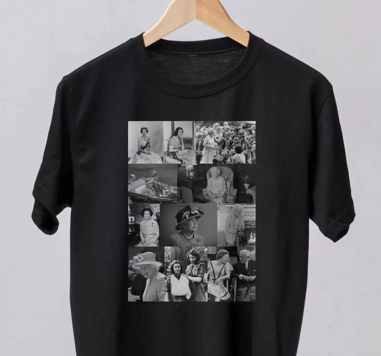 Unique and memorable Elizabeth II t-shirt with black and white pictures of unforgettable moments during her reign.This design makes it possible for you to go down memory lane with these various pictures of the Queen.