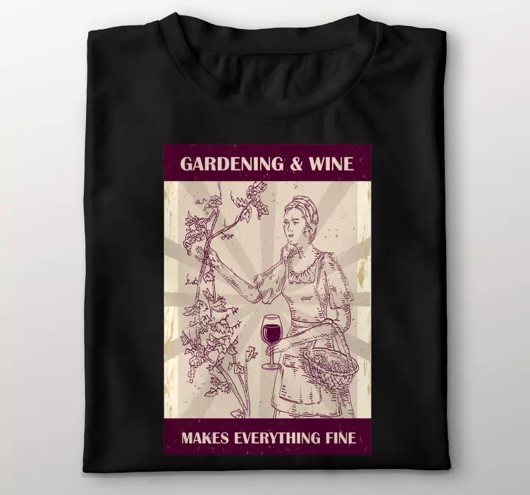 Gardening and wine custom t-shirt - Vintage style design illustrating a woman in the garden, picking grapes into a basket and with a red wine in her hand. Its a hand drawn illustration with grungy background with abstract sunburst, the design is captioned with text that reads ''Gardening and wine make everything fine'. The funny wine lover accessory is a great gift for a gardener or houseplant lover. It is original, easy to maintain and long lasting, available in different sizes for fit. Select the options that suit you and place order for it.