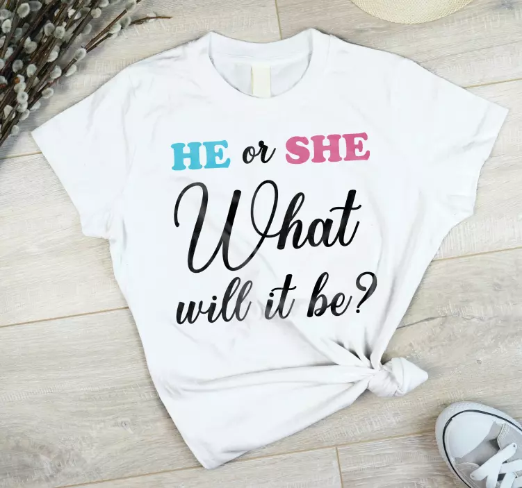 Reference: T4722This eye-catching apparel features a fun question about gender reveal, asking 'What will it be?' with vibrant text. The playful use of colors adds excitement, making it perfect for family celebrations and memorable moments.