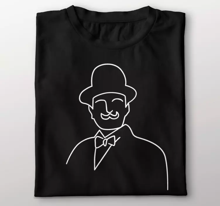Hercule Poirot line art custom t-shirt - Simple line drawn art illustrating the fictional character of great detective Hercule Poirot. Elegant pencil art drawing that smoothly illustrate the character on a hat, his moustache and with a gentle man's suit. Cool addition to a closet for every fan and lover of this Agatha Christie's detective character. The shirt colour can be customized in any one of the available colours on the catalog. Easy to maintain shirt, it is of good quality, quality design print as well. The Hercule Poirot character t-shirt is available in various sizes to select from.
