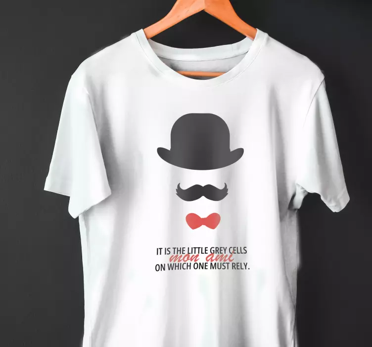 Hercule Poirot text custom t-shirt - Wear your favorite movie character in style, the design depict detective Poirot's face. Illustration of a big black hat sitting on an imaginary face with a large moustache and a red bow-tie. It is accompanied with text phrase that reads 'Its the little grey cell mon ami, on which one must rely''. The Poirot character shirt's colour is customizable in any one of the available options on the catalog, it also comes in different sizes for fit. It is original and easy to maintain. Add to your cart to place order now.