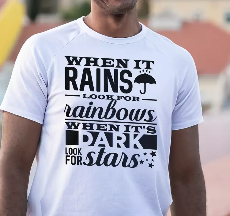 Introducing the Inspiring positive outlook t-shirt, a vibrant expression of hope and positivity! This beautifully designed t-shirt features a dazzling rainbow that arches gracefully over stars, set against a backdrop of gentle rain. The heartwarming quote captures the essence of positive thinking and inspiration, making it a perfect choice for those who embrace a motivational lifestyle. Wearing this t-shirt is not just a fashion statement; it's a reminder to always look for the rainbows in life!