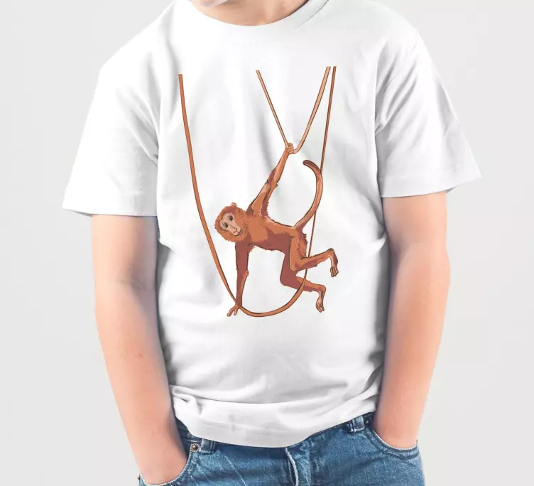 Introducing our delightful Kids t-shirt monkey swinging on a rope, featuring a charming illustration of a playful monkey joyfully swinging through nature. This vibrant design captures the essence of fun, making it perfect for children who love animals and adventure. With its eye-catching graphics, this t-shirt is sure to bring smiles and spark imagination!