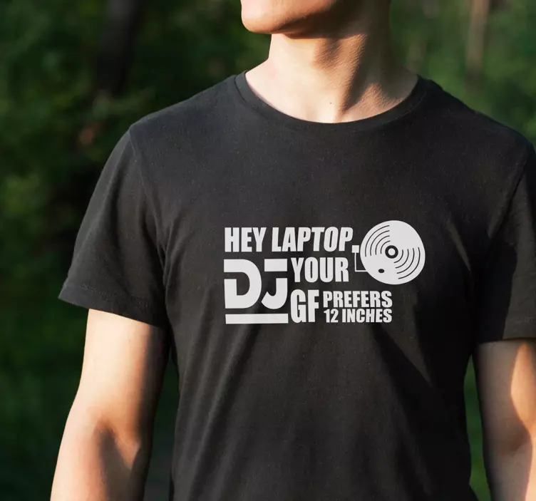 Laptop DJ t-shirt print - Cool shirt for old-school audio lovers, turntablism enthusiasts, and DJs. The shirt features an illustration of a turntable with text that reads, 'hey, laptop, your DJ girlfriend prefers 12 inches'. Show what you do wearing this cool shirt.