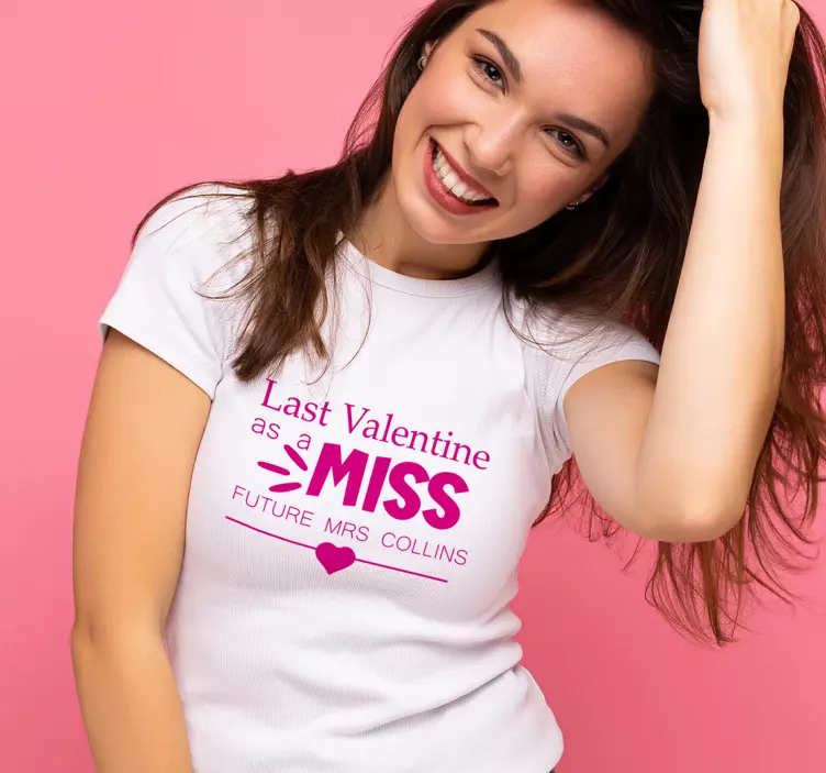 A beautiful custom shirt to announce yourself as a future Mrs. during valentine's. It's a personalisable with a name and the text reads 'Last valentines as a Miss future Mrs..'