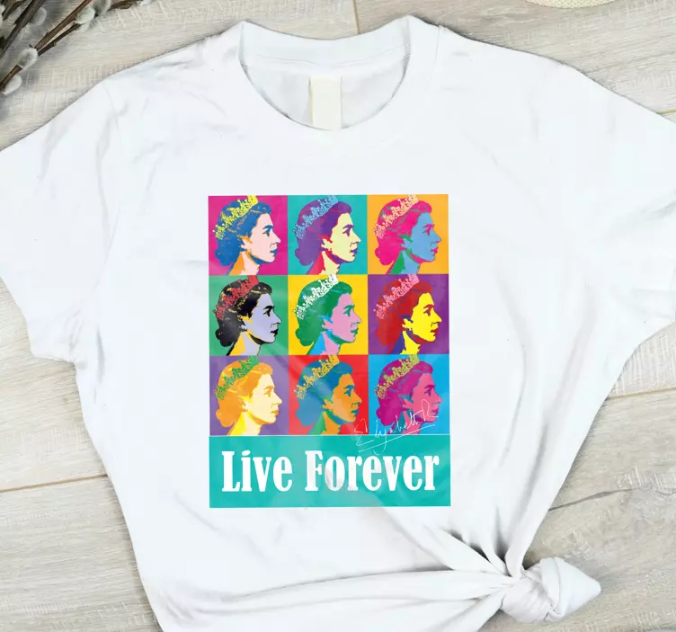 Colourful and artistic Live Forever t-shirt of the Queen. This is an artistic design inspired by a famous painting of the Queens face seen from the side wearing a crown in various colours and the text "Live Forever". Enjoy this design in your wardrobe to remember the Queen in a unique and creative way at the same time.