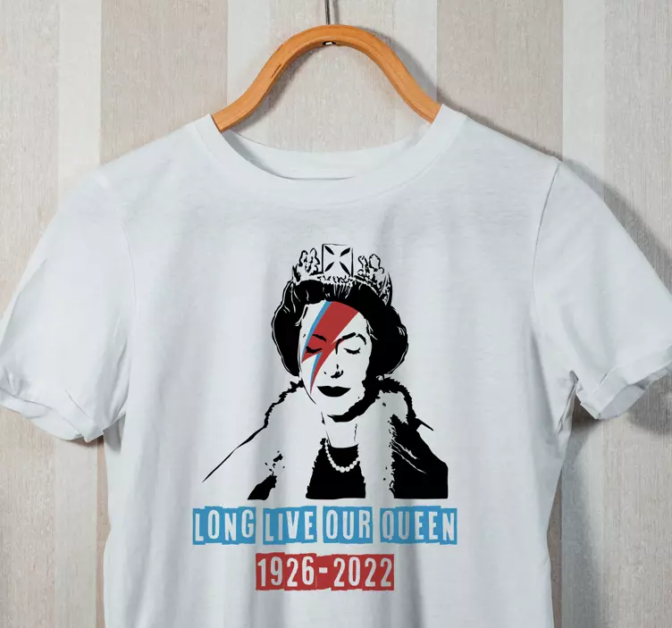 Unique and creative Banksy Queen t-shirt. A black and white design of the Queen with a pink and blue lightning and the texts "Long Live the Queen" and "1926-2022". Enjoy this beautiful design in your wardrobe or give it to a dearly beloved.