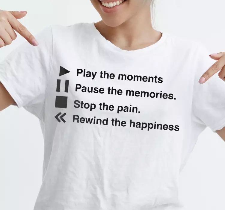 Introducing the Moments of happiness t-shirt, a unique blend of style and inspiration! This design features playful elements like play, pause, and stop icons, along with motivational text that evokes emotions and memories of happiness. The black and white color scheme enhances the striking slogans and quotes, making it a perfect choice for those who want to wear their positivity on their sleeve!