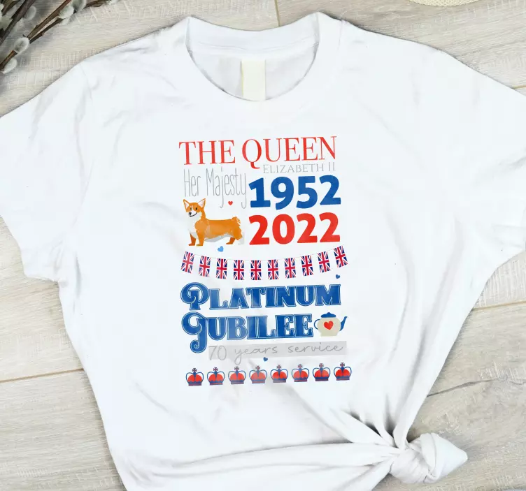 Platinum Jubilee art custom t-shirt designed in honor of the queen's celebration and mark of service. It is a colorful text print shirt, with different font style, it features the union jack, crown and corgi dog and other features. The text reads 'The queen her majesty 1952-2022'' 70 years service. This product is of quality, quality print that does not fade, easy to maintain and durable. It is available in different sizes, choose the option that suit you and place order for it. Our payment options are safe and secured. Add to cart to buy now.