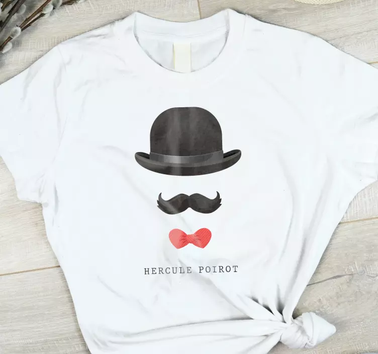 Poirot Iconic custom t-shirt - Cool iconic print that depicts the personality character of Poirot . It illustrates a black hat, black moustache and a red bow-tie. Its a painted illustration and has a text caption that reveal the character just below the icons displayed. If you are a fan of the movie character Hercule Poirot then this Poirot character icon shirt print is for you. It is an original print which does not fade, the shirt material is of top quality and easy to maintain. Available in different sizes for different fit, add to your cart to place order now and it would be delivered in just couple of days.