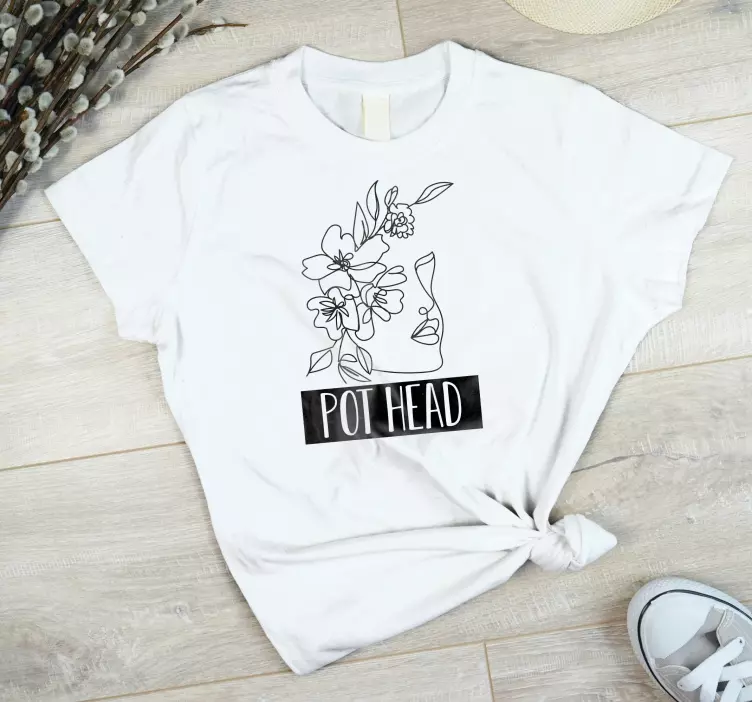 Pot Head custom t-shirt design - The design displays a minimalist hand drawing of a woman's' face with flower as the head. The elegant thin line face drawing is captioned with text just below it that reads ''Pot head', this is a cool plant humor for lovers of gardening, cultivating plants and just think everything plant. The lettered text is highlighted for emphasis. The product is original, you would enjoy it for as long as you want, provide the name to be customized on it in the text field and it would be made at your order. Available in different sizes for fit.