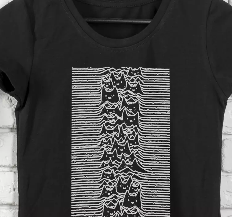 Pulsar cat custom t-shirt - Cool shirt design print depicting rhyme of pulsar wave, it shows minimalist seamless wavy line drawing that run from one end to the other. Its a horizontal line pattern which beaks on the middle creating cat faces and abstract mountains. The colour can be customized in any one of the options available on the catalog section. Every science and electronic geek should have this piece in the closet. It is original, easy to maintain and durable, choose the size that suit you best and place order for it.