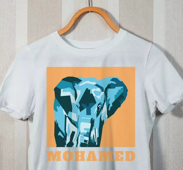 Reference: T4979This design showcases a striking elephant portrait created in vibrant geometric shapes. The color palette features various shades of blue complemented by an orange background, making it a captivating piece. The name 'Mohamed' is prominently displayed, adding a personal touch.