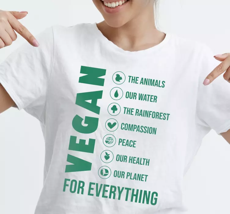 Vegan for everything custom t-shirt - Cool shirt for vegan describing and enlightening the importance of being a vegan. Perfect for the animal lover or vegan in your life. The text lettering is made in bold text lettering and in style, listing benefits of vegan with icons. The colour can be customized in any one of the colours available on the catalog, the shirt colour can also be customized. It is original, easy to maintain, original print and highly durable. Available in different sizes, pick the size that suit you and place order with our safe and secured payment options.