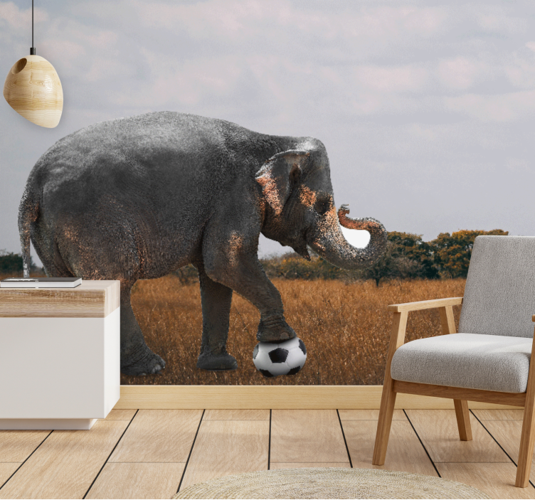 Transform your living space with our stunning Animals wall mural elephant playing soccer. This vibrant design features a playful elephant engaging in a game of football against a backdrop of the serene savannah. The photomontage beautifully captures the essence of wildlife and nature, bringing the spirit of the wild right into your home!