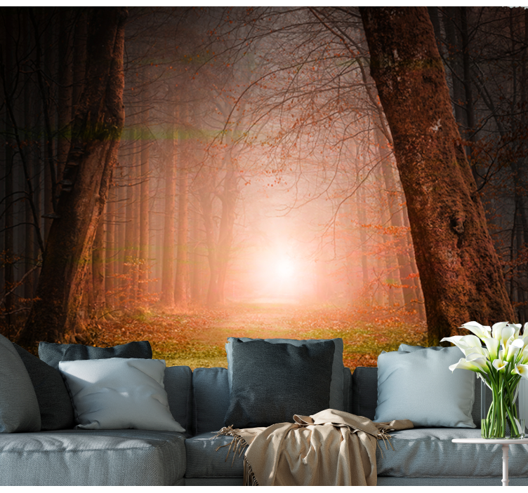 Transform your space with the Enigmatic Woodland Trail forest wall mural, where the beauty of a forest comes alive! This stunning design captures the essence of a serene woodland, featuring majestic trees bathed in warm sunshine, with gentle sunbursts illuminating a winding path through a tranquil autumn setting in Poland. The soft fog adds a layer of mystery, creating an inviting atmosphere perfect for any room.
