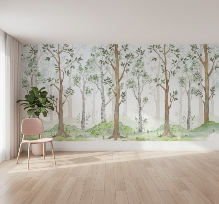 Reference: F11945Transform your living space with our exquisite Forest wallpaper in soft woodland hues. This stunning design features gentle pastel shades that evoke a serene woodland atmosphere, complete with intricately detailed trees and subtle foliage patterns. The non-woven wallpaper is crafted in matte colors, ensuring a sophisticated finish that enhances any room. With its durable nature, this wallpaper is designed to last between 10-15 years, making it an ideal choice for long-term decor solutions!