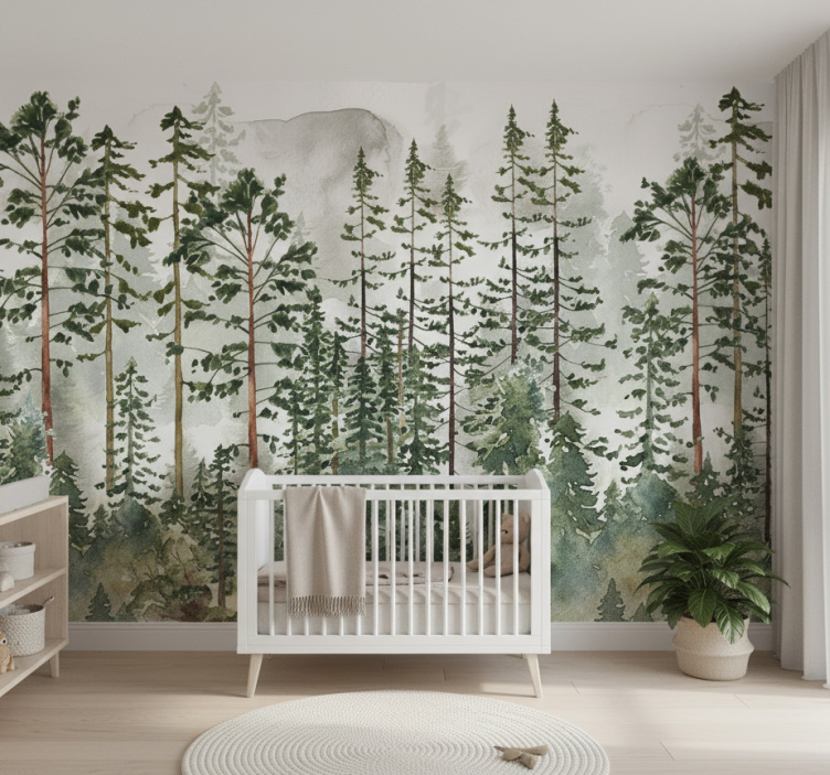 Reference: F11915Transform your child's nursery into a magical woodland escape with our Forest wallpaper woodland wall nursery. This stunning design features enchanting trees, playful animals, and serene landscapes, all crafted in beautiful matt colours that create a warm and inviting atmosphere. The non-woven material ensures durability, making it a perfect choice for any nursery setting.
