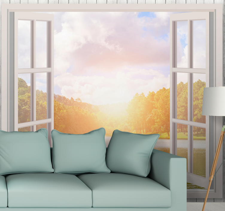 Transform your living space with our stunning Nature wallpaper sunrise over lake, featuring a breathtaking design that captures the essence of tranquility. Imagine gazing through a window to a picturesque lake at sunrise, surrounded by a serene forest and majestic trees. This captivating landscape creates a trompe l'oeil effect, making it feel as if you are truly immersed in nature's beauty as the golden sun rises above the horizon.