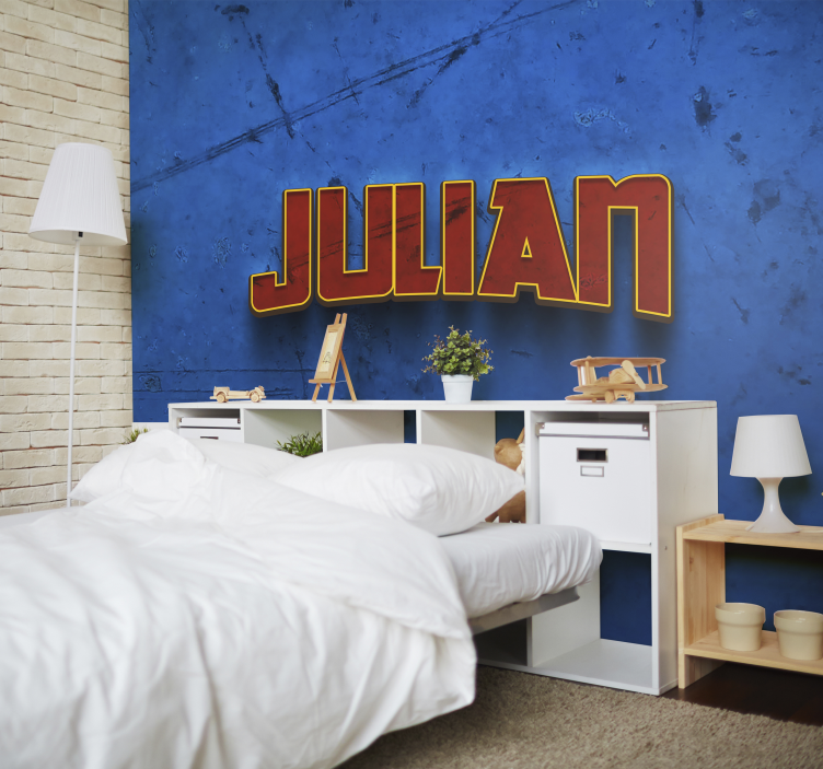 This superhero wall with name custom mural printing features a lovely concrete textured wall mural that looks real and blue. The textured concrete wall has crack lines and a peeling distressed appearance. It has a boldly lettered name on the surface in a beautiful text font color in a superhero style. This custom name wall mural is suitable for teenagers to decorate their room, creating their own space with personalization. It's also great for younger kids and can be customized with whatever name or text of choice. The product is made with quality material, highly durable, resistant, matte, and rumple-proof.