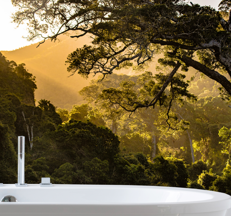 Transform your space with our stunning Wall mural nature verdant forest landscape, a breathtaking design that captures the essence of a serene forest. This captivating mural features majestic trees basking in golden sunlight, inviting natural light to dance across the landscape, while the soft silhouette of distant mountains creates a tranquil backdrop. Experience the beauty of nature inside your home!