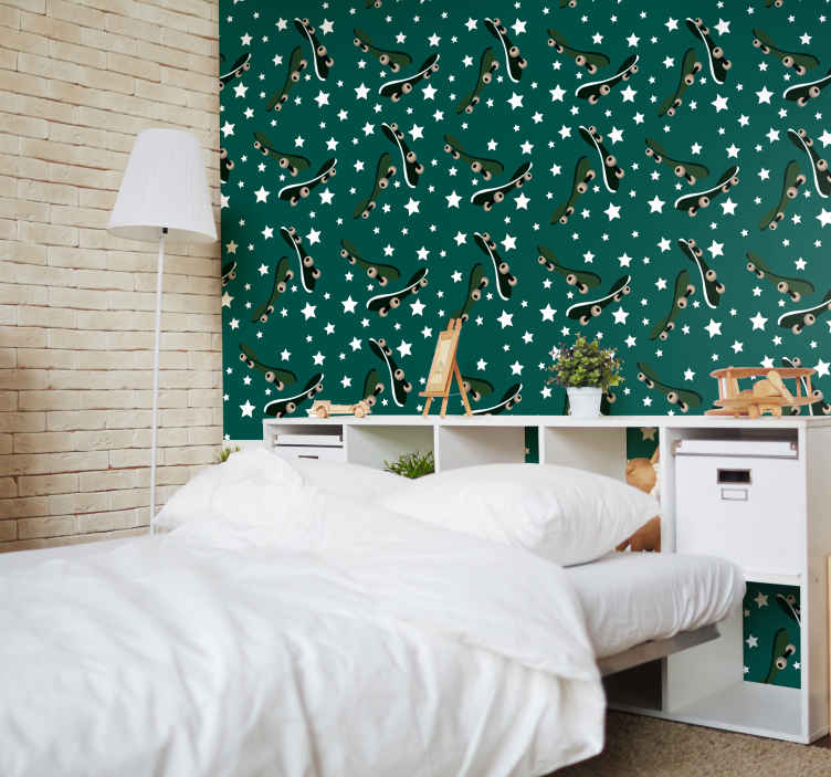 Enhance any room with this exciting design from our skateboard collection. The seamless pattern features skateboard graphics with stars on a blue background.