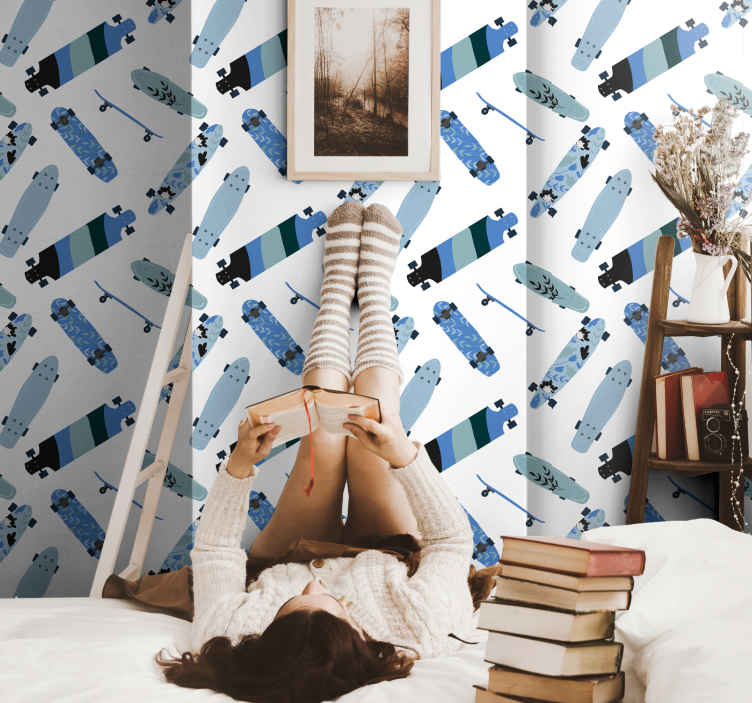 Transform your room with this beautifully designed skateboard pattern wallpaper. The seamless pattern features blue skateboards with floral and abstract designs on a white background, creating a cheerful and vibrant look in any space.